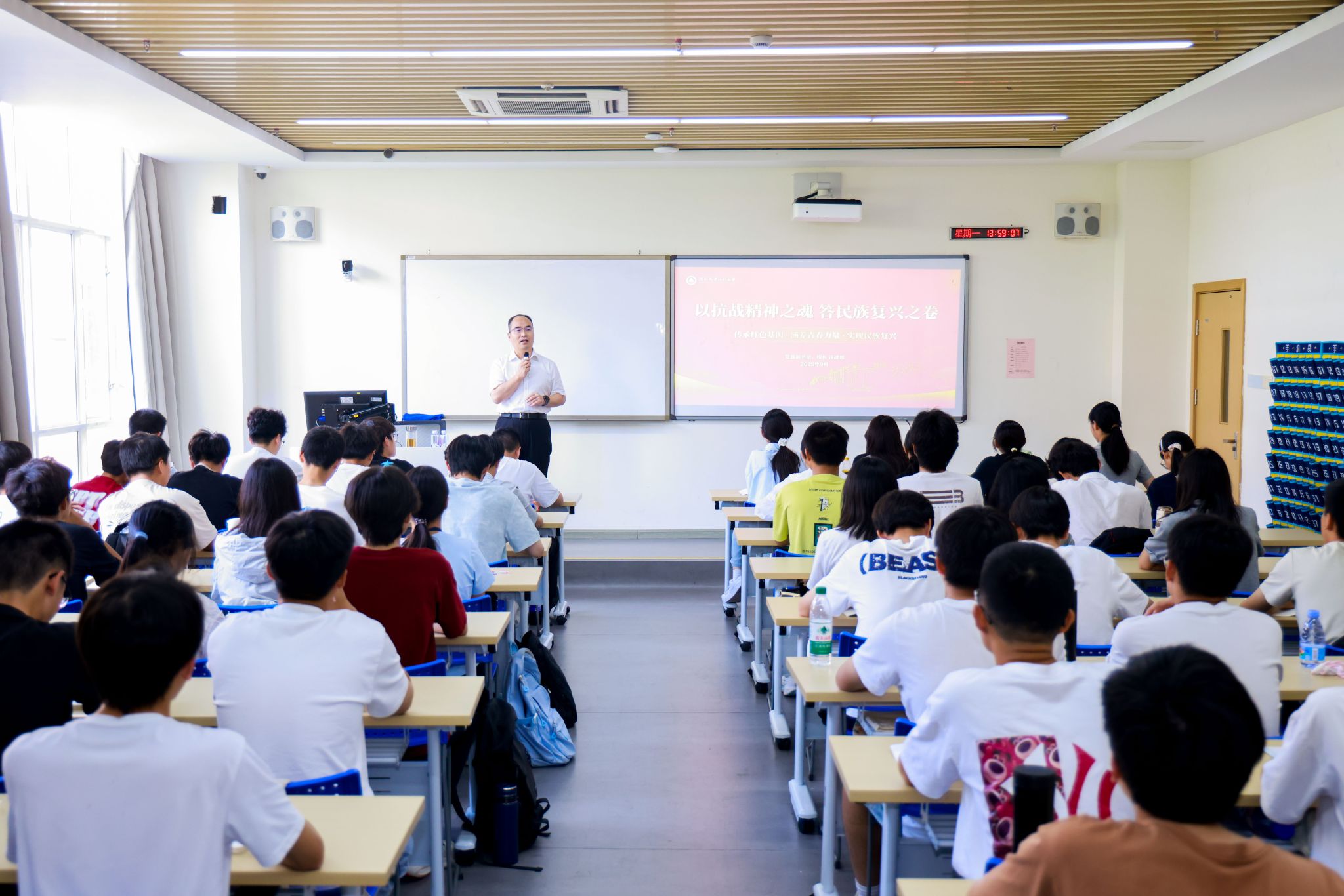 随后,许建领从“历史之魂”“时代之卷”“青年担当”三个方面诠释了“以抗战精神之魂 答民族复兴之卷”的主题。他带领同学们回顾历史,从十四年艰苦卓绝的抗战历程中汲取伟大抗战精神的磅礴力量;洞察时代,在国内外形势与深圳范例中找准青春建功的奋斗坐标;指引未来,于时代浪潮中明确个人成长与民族复兴相结合的前进方向。