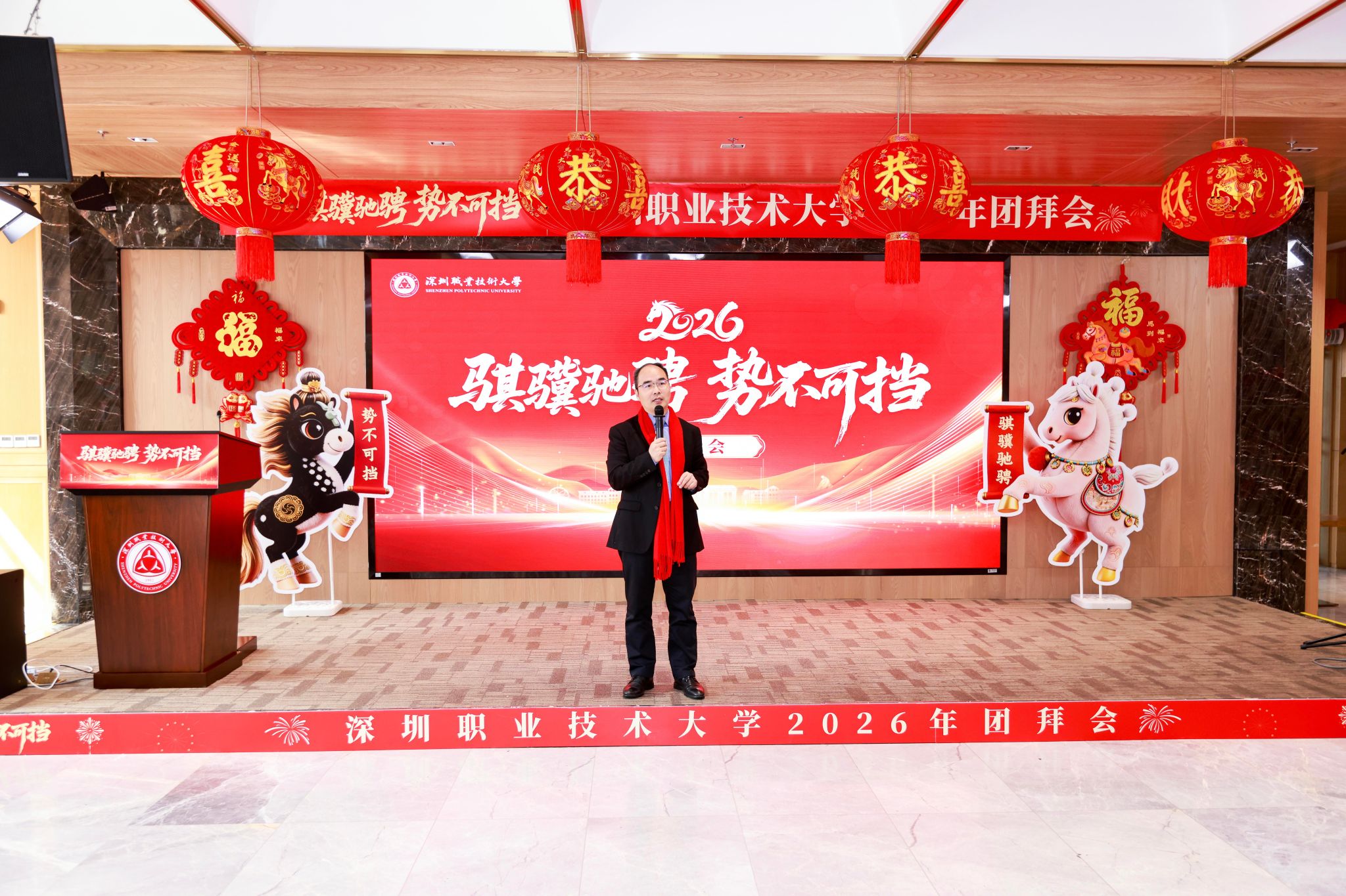 2月16日(农历除夕)深圳职业技术大学“骐骥驰骋 势不可挡”2026年寒假留校师生新春团拜会在留仙洞园区锦园三餐厅温馨举行校党委副书记、校长许建领与近80名因备战技能大赛、投身科研实训、保障校园运行而留校过年的师生欢聚一堂共度除夕。