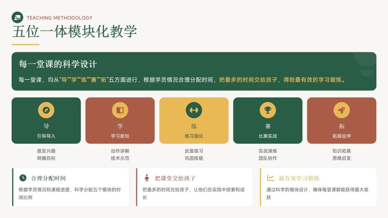 教学优势:五位一体模块化教学——把课堂交给孩子,使拼搏常驻心间。